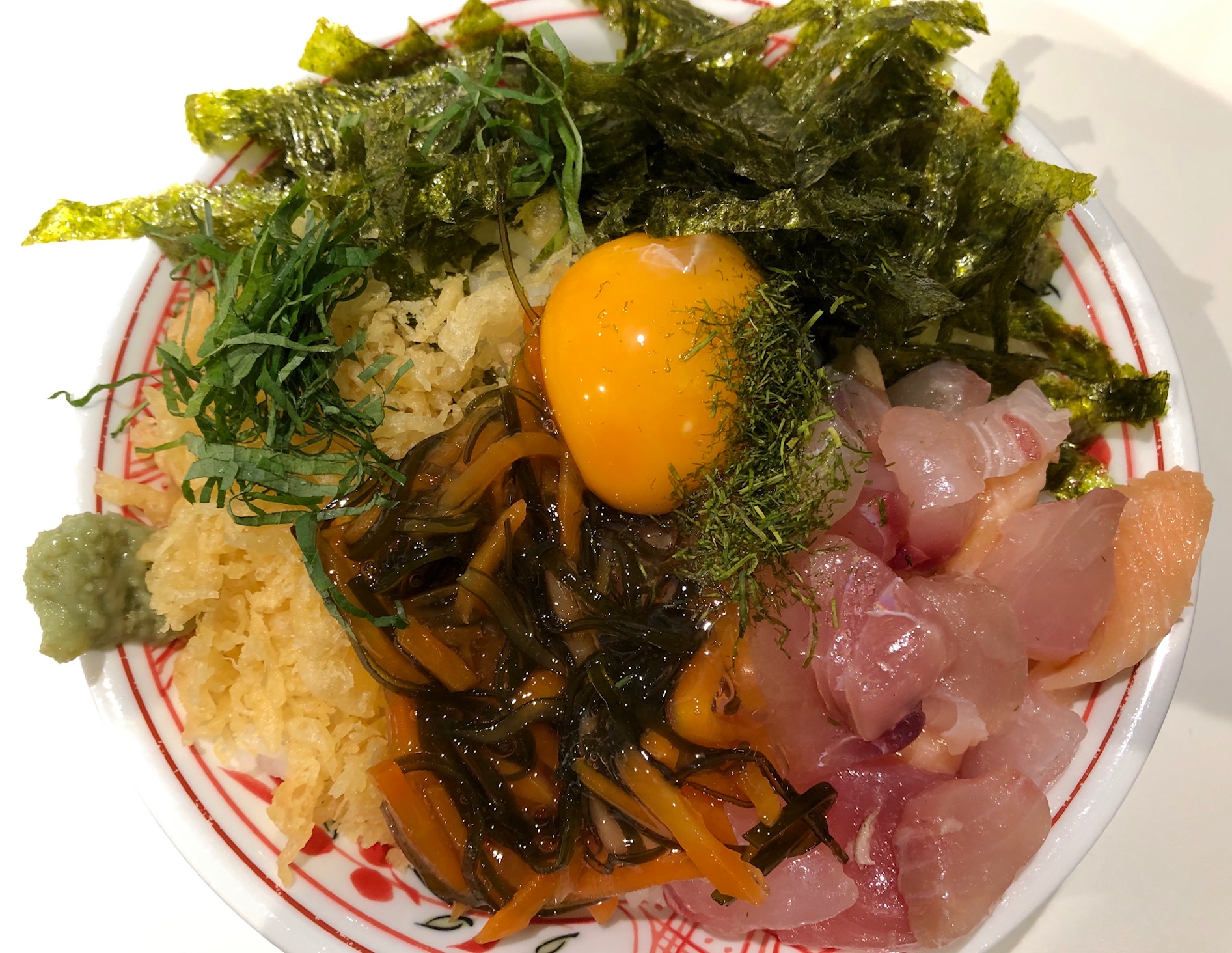 何種類かの刺身の切れ端と天かすや卵を一緒