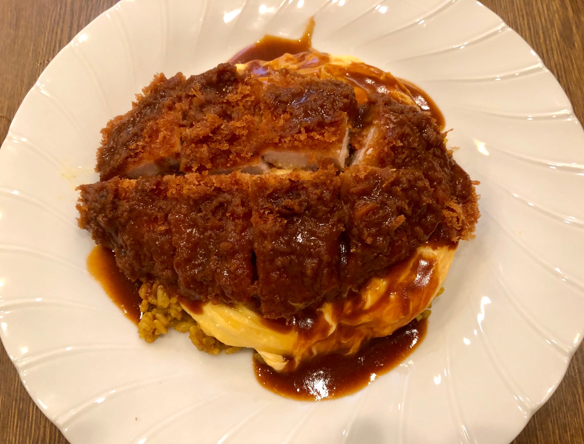 イカレー・オムライスの上にトンカツ、エビフラ