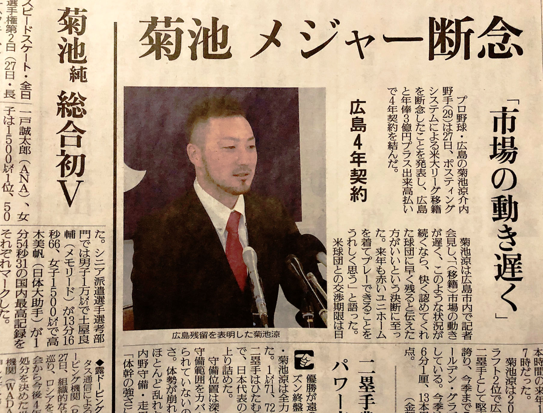 朝刊のスポーツ欄に【菊池 メジャー断念】の文